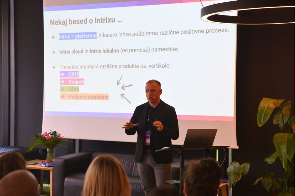 Oder je zavzel Blaž Glogovčan, vodja projektov na Interi, in udeležence popeljal skozi primere uspešnih implementacij Intrix rešitev v različnih slovenskih podjetjih. Poudaril je prilagodljivost Intrixa pri digitalizaciji procesov in reševanju poslovnih izzivov.