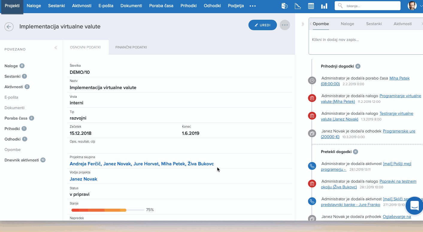 Vse s projektom povezane vsebine so v enem oknu, do njih pa se pomikate po strani navzdol ali preko levega menija, ki vam omogoča hitrejši dostop do povezanih vsebin. S klikom na vezano vsebino v levem meniju se pomaknete do nje, vidite pa tudi število zapisov pri konkretni vezani vsebini.
