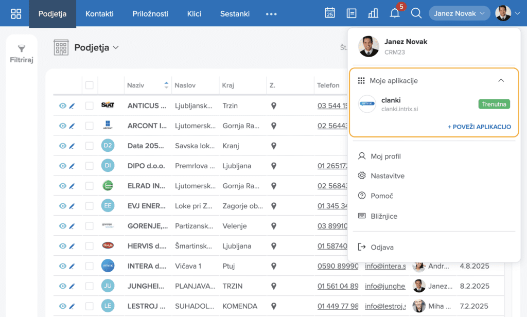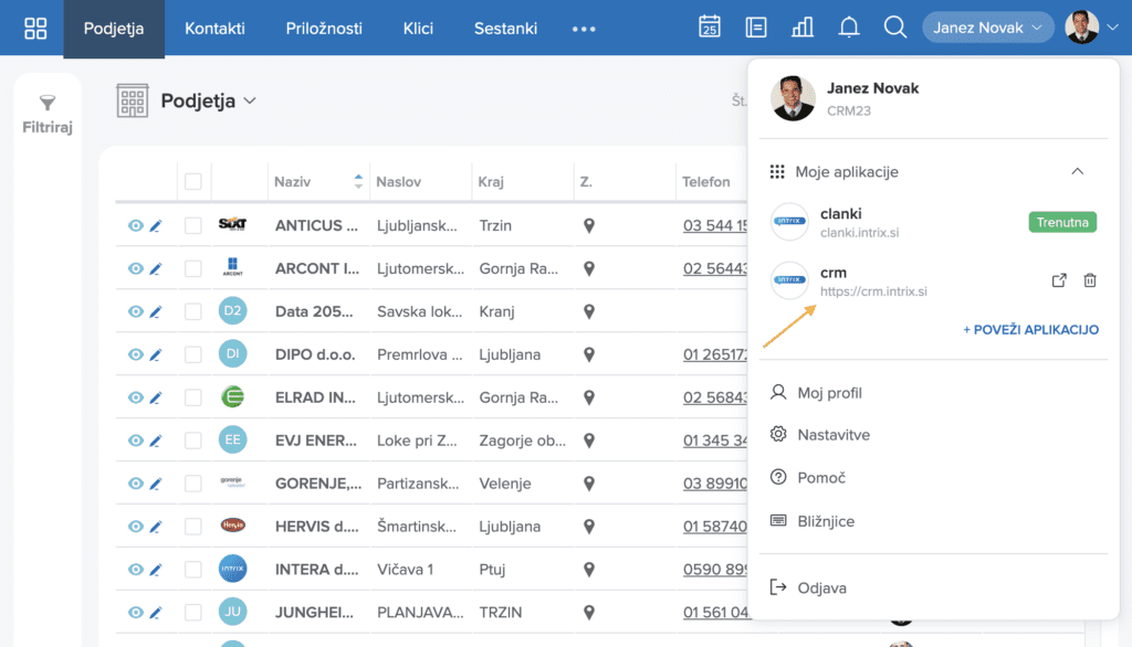 V Intrixu je zdaj omogočeno enostavno preklapljanje med povezanimi aplikacijami neposredno iz uporabniškega profila. Aplikacije lahko povežemo na enem mestu in nato med njimi preklapljamo brez ponovnega vpisovanja naslovov.