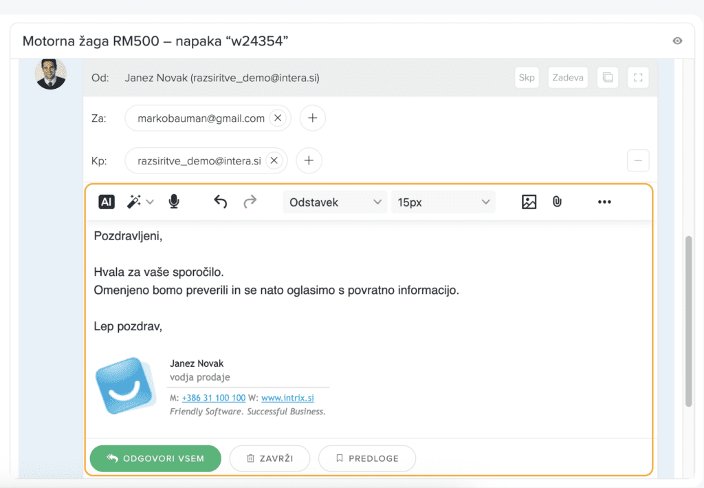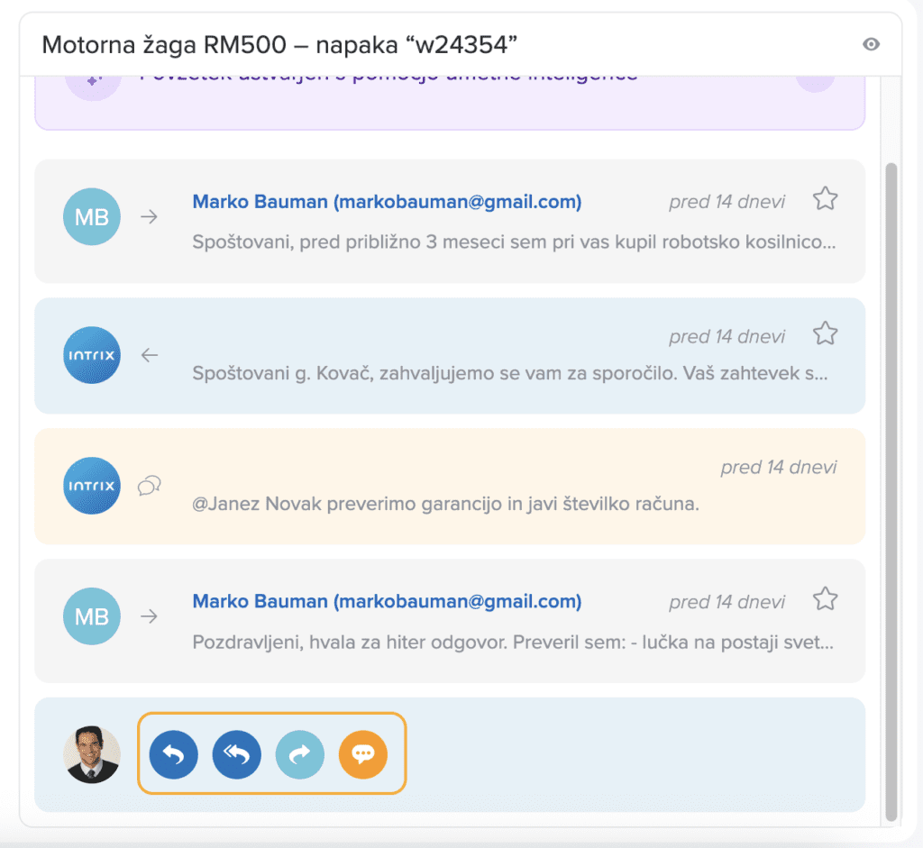 Pod vsakim sporočilom imamo na voljo štiri možnosti za nadaljnjo komunikacijo. Odločimo se lahko, da odgovorimo le pošiljatelju, da odgovorimo vsem osebam, ki so vključene v komunikacijo (v poljih “Za” in “Kopija“), da sporočilo posredujemo naprej ali pa dodamo interni komentar.