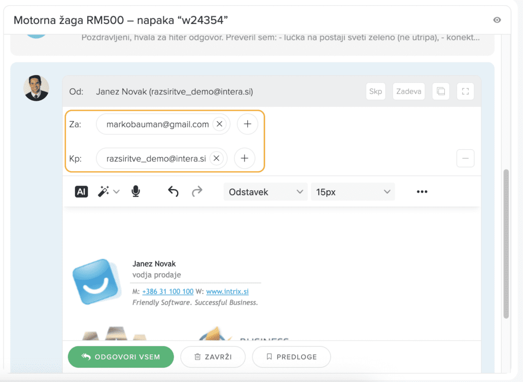 Ko želimo stranki odgovoriti, kliknemo na drugi gumb “Odgovori vsem” (če so v kopiji vključeni tudi drugi prejemniki). Na modrem ozadju se odpre novo okno, kjer vidimo prejemnike sporočila in tudi tiste, ki so v skriti kopiji. Če želimo dodati še prejemnika v kopijo, moramo najprej razpreti ustrezno polje. To storimo s klikom na “Kp” v zgornjem desnem kotu okna.