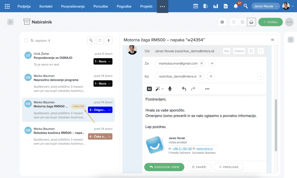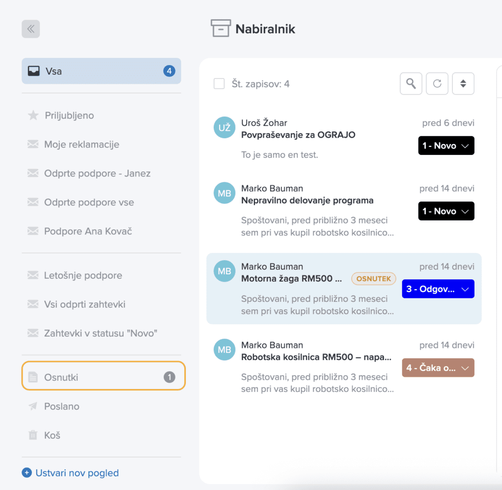 V nabiralniku lahko opazimo tudi različne statuse, ki so dodeljeni posameznim zahtevkom. To nam omogoča, da hitro ločimo med zahtevki, ki še niso bili sprejeti s strani podporne službe, tistimi, ki so že v obdelavi, zahtevki, ki čakajo na dodatne informacije, ali pa tistimi, kjer smo stranko že obvestili. Po želji lahko nastavimo imena statusov, ki nam najbolje ustrezajo glede na način našega poslovanja.