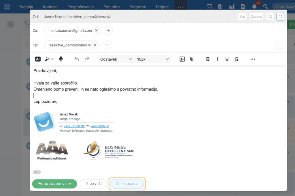 Novo predlogo lahko ustvarimo neposredno iz že pripravljenega odgovora. Ko pripravimo odgovor, ki ga želimo shraniti kot predlogo, spodaj kliknemo gumb Predloge. Odpre se spustni seznam z vsemi že shranjenimi predlogami.