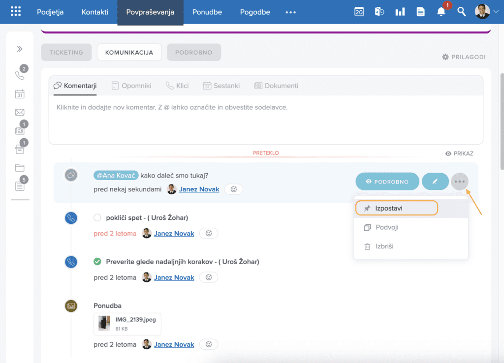 Na kartici vsakega zapisa, na primer podjetja, kontakta ali povpraševanja, so komentarji urejeni tako, da omogočajo hitro in pregledno obveščanje sodelavcev.