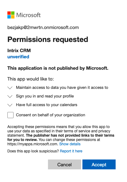 Nato nas Intrix preusmeri na izbiro Microsoft računa kjer izberemo želeni račun, vpišemo geslo ter potrdimo dostop preko gumba “Accept“.
