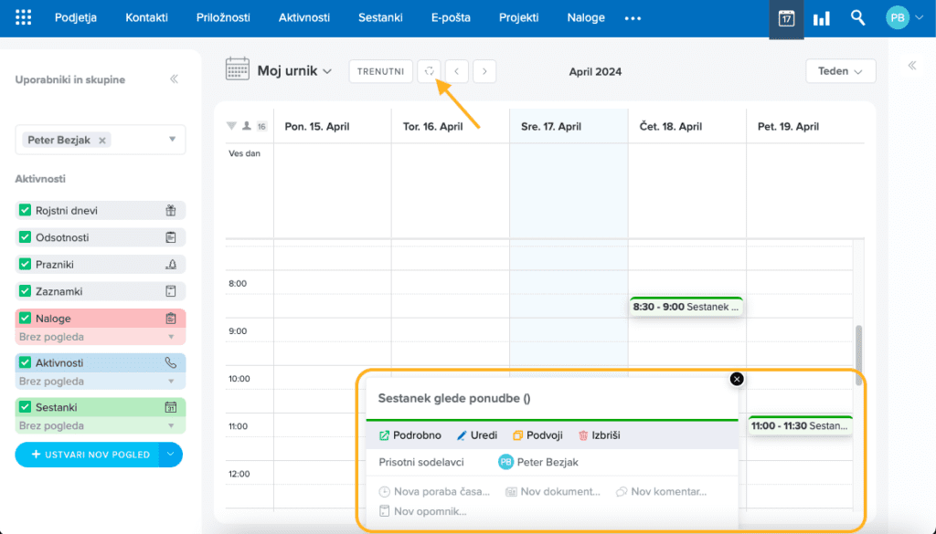 V Intrixu dodamo nov sestanek – lahko kar preprosto preko koledarja ali pa preko zavihka “Sestanki“.