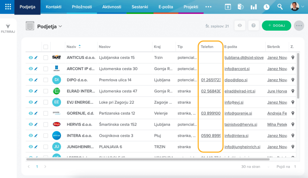 Primer: Na zavihku “Podjetja” smo opazili, da nekaterim podjetjem manjkajo telefonske številke.