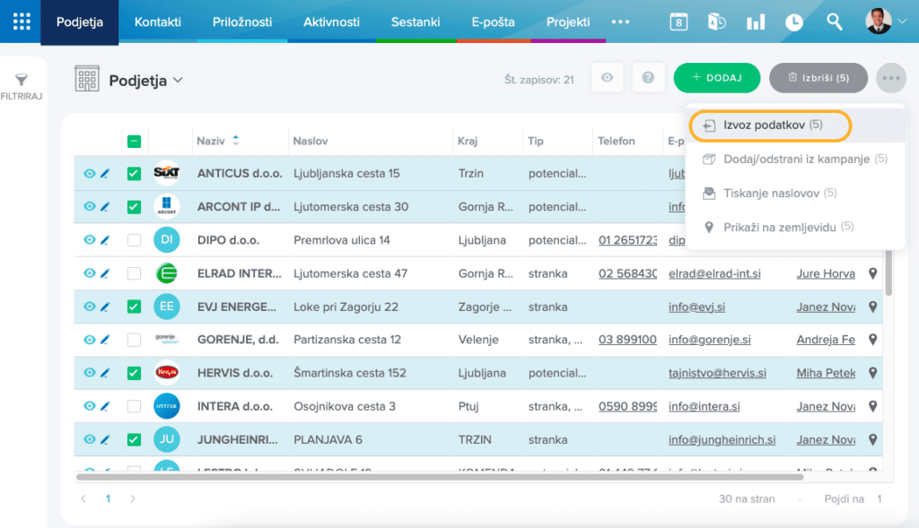 Denimo, da imamo bazo kontaktov, kjer med drugim beležimo kateri kontakti so aktivni v podjetju in kateri ne. Zato bomo določenim kontaktom spremenili lastnost „Aktiven“ iz Ne v Da. Prvi korak je izvoz podatkov, ki jih želimo posodobiti. Najprej s pomočjo filtrov izberemo želene kontakte ter jih izvozimo s klikom na povezavo „Izvozi“ na vrhu seznama.