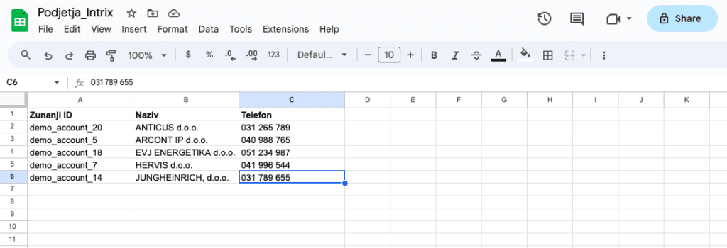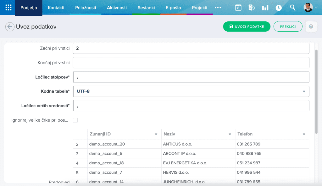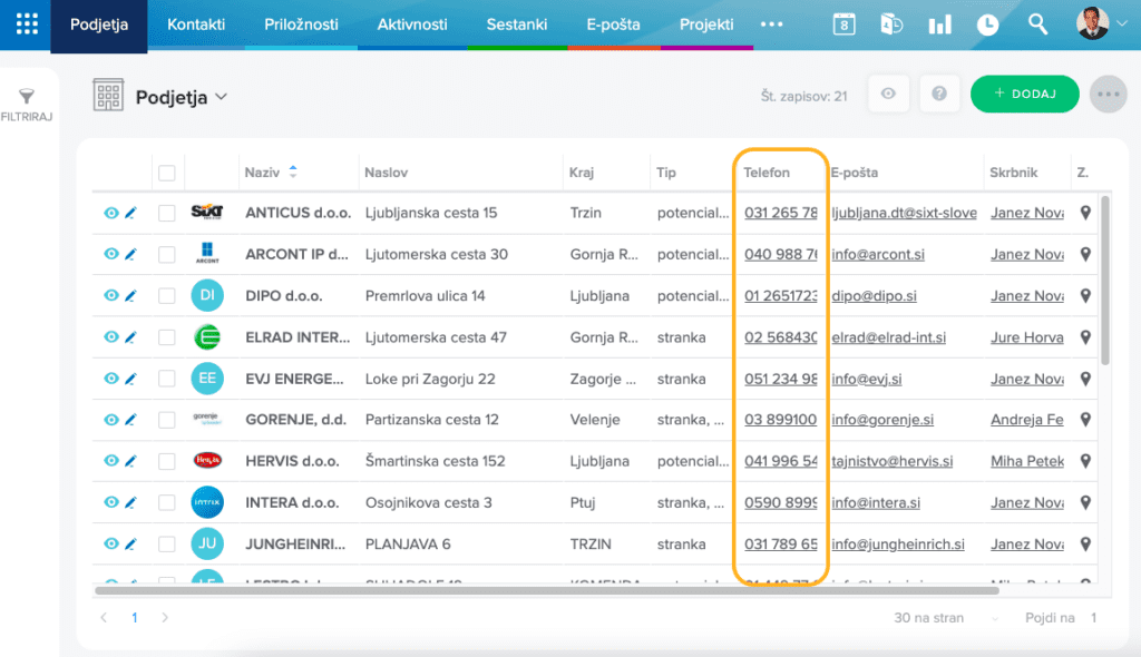 V primeru, da smo podatke dobro pripravili, se nam bodo vsi zapisi uspešno uvozili. Tudi na zavihku “Podjetja” lahko vidimo uspešno dodane telefonske številke.