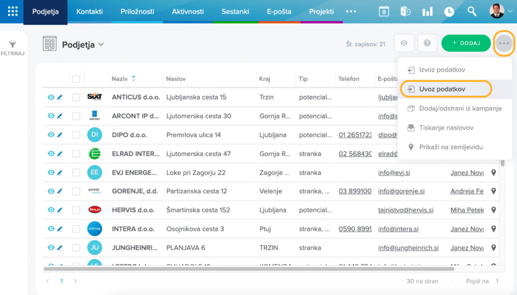 Vrnemo se nazaj v Intrix in nato na zavihku “Podjetja” ponovno kliknemo na tri pikice, pri čemer pa sedaj izberemo opcijo “Uvoz podatkov“.
