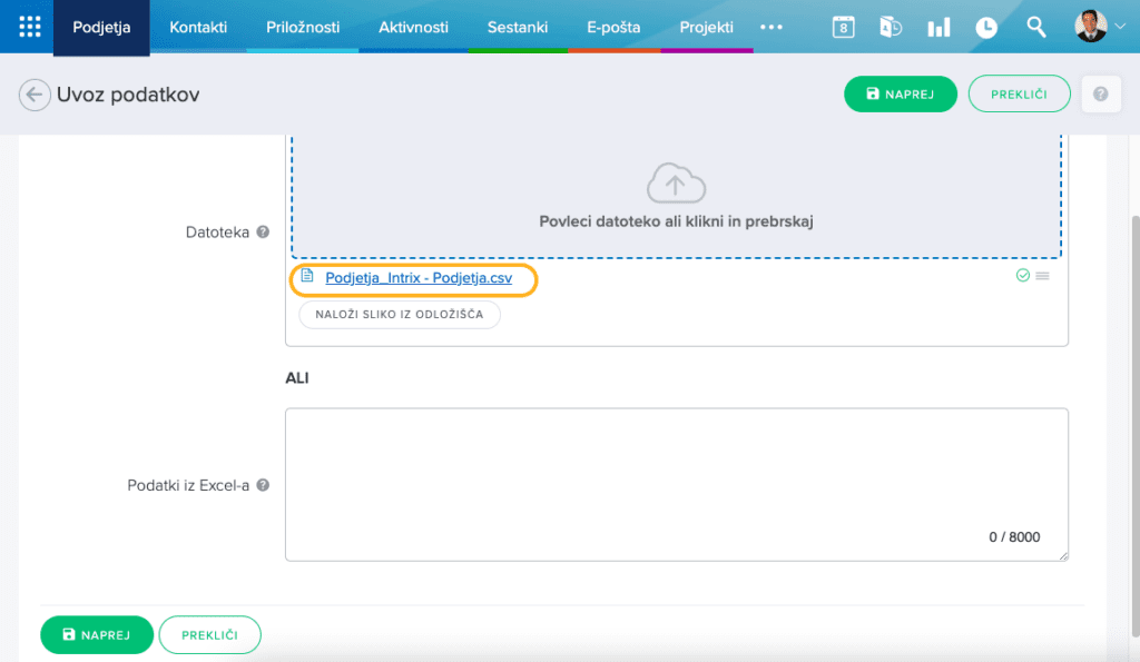 Dodamo datoteko ter kliknemo na gumb “Naprej“.