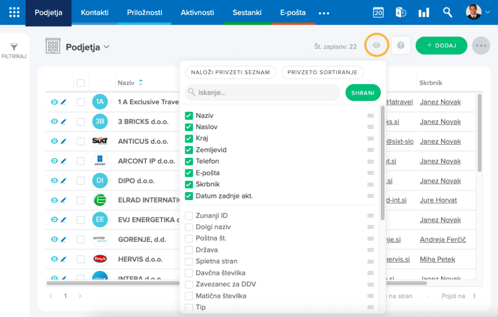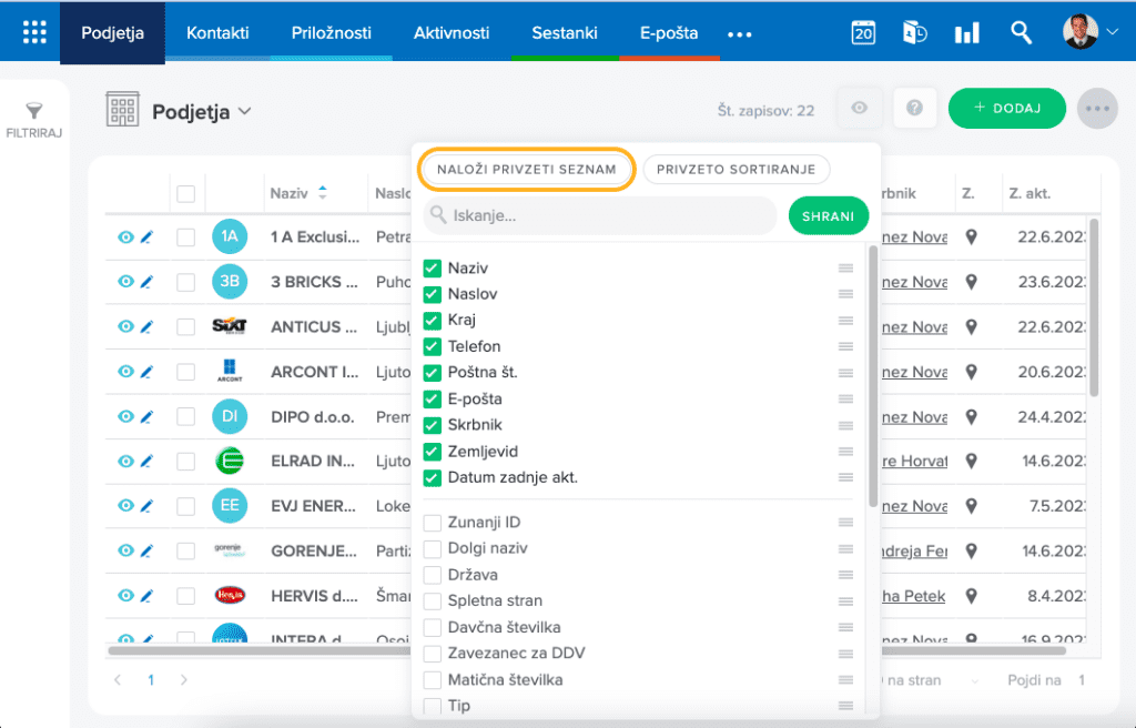 S klikom na okvirček pred imenom, označimo kateri stolpcem želimo, da je na seznamu zavihka prikazan. Stolpce lahko s klikom tudi odstranimo. Spremembe na seznamu bodo vidne ob kliku na gumb “Shrani“. Vsaka sprememba sortiranja se shrani v vaš uporabniški profil. Tako si lahko v vseh zavihkih nastavite poljuben način sortiranja.