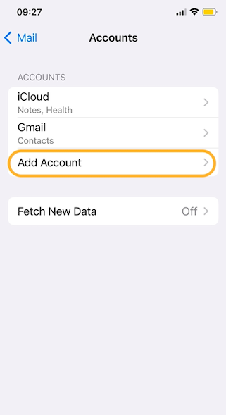 Na iPhonu kliknete Settings, nato klikneteMail ter Add Account