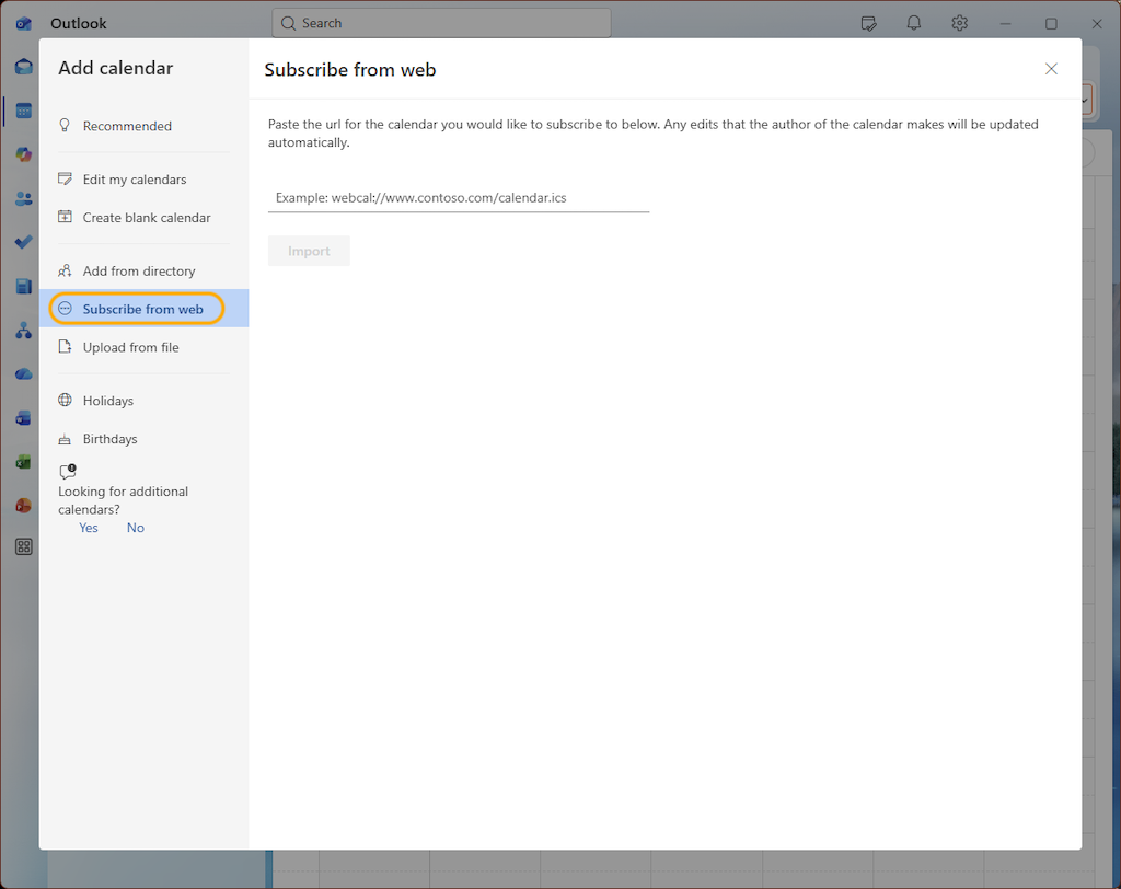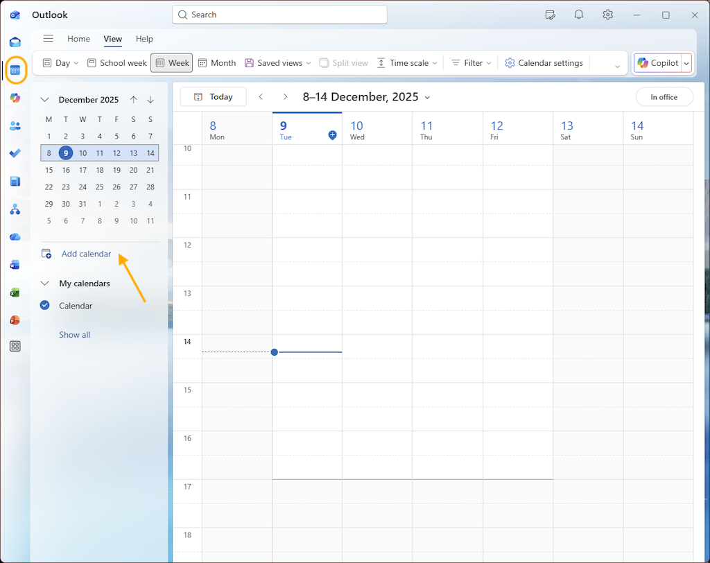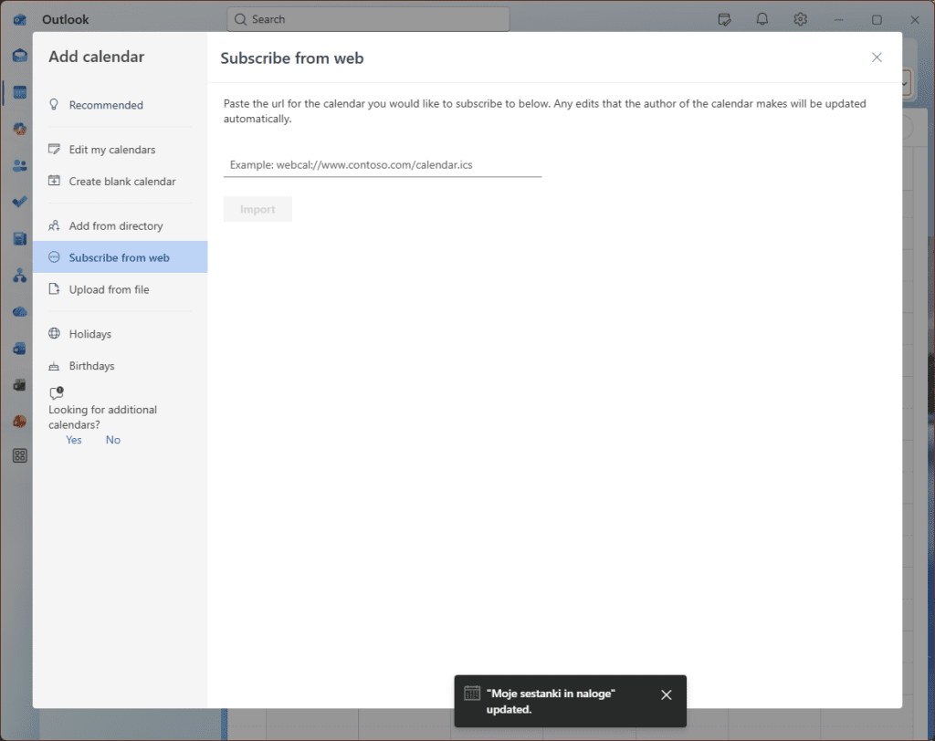 Odpremo Microsoft Outlook in izberemo koledar (kliknemo na ikono koledarja v orodni vrstici na levi strani). Nato izberemo opcijo “Add calendar“.