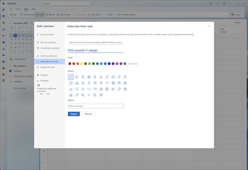 Koledar v sistemu Intrix lahko na enostaven način povežete tudi s koledarjem v Outlooku. Tako boste imeli ves čas pregled nad svojimi aktivnostmi na enem mestu. Povezava je enosmerna in poteka iz Intrixa v zunanji koledar.