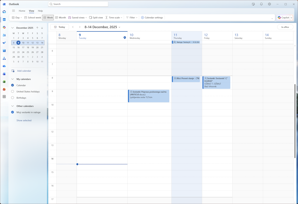 V Outlook koledarju so zdaj vidni vsi vnosi iz Intrix koledarja, kar pomeni, da so sestanki, naloge in ostali dogodki uspešno sinhronizirani.