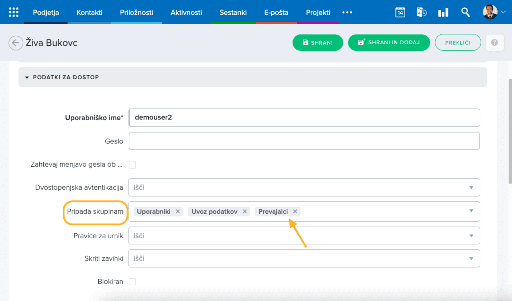Kot omenjeno že zgoraj, je potrebno uporabniku najprej v polju “Pripada skupinam” dodati skupino “Prevajalci“.