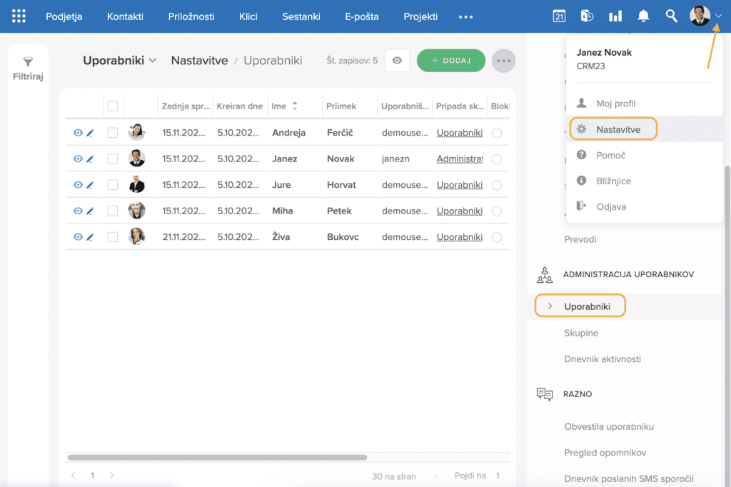 Kot administrator aplikacije lahko uporabnikom preprosto dodajate ali odstranite uporabniške skupine na profilu uporabnika. Preko nastavitev uporabnika se na desni strani pomaknete do sklopa “Administracija uporabnikov“, kjer izberete možnost “Uporabniki“. Prikaže se nam seznam vseh uporabnikov, ki jih imamo v aplikaciji.