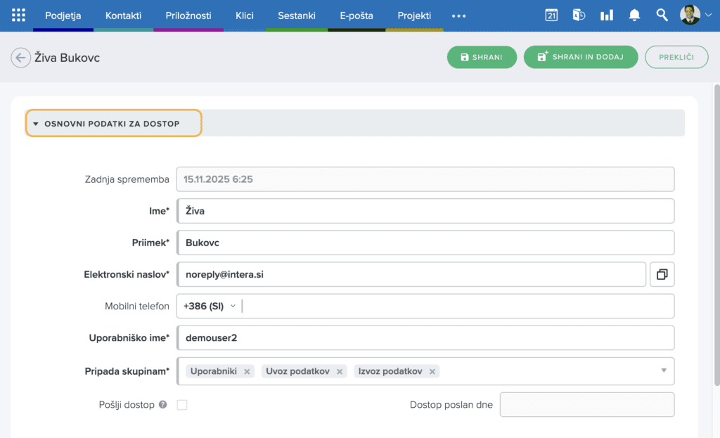 Uporabniki Ta skupina vidi in ureja vse zavihke, nima pa nadzora nad urejanjem šifrantov in drugimi administratorskimi orodji.