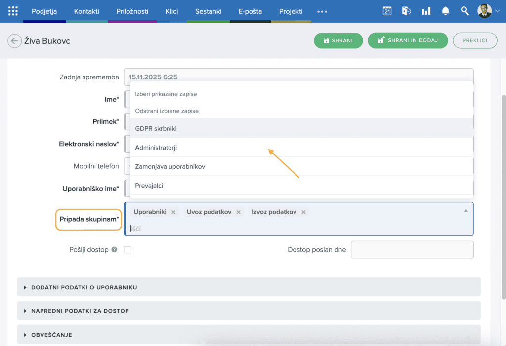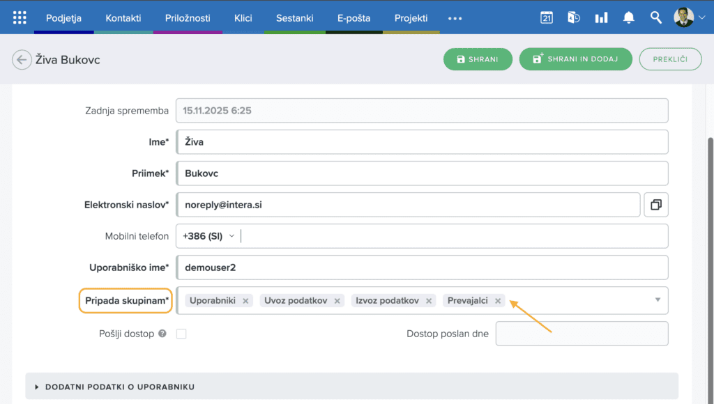 Uporabniške skupine poljubno dodajamo ali odstranjujemo v polju “Pripada skupinam“. Ko smo končali z urejanjem skupim, moramo samo še shraniti profil uporabnika.