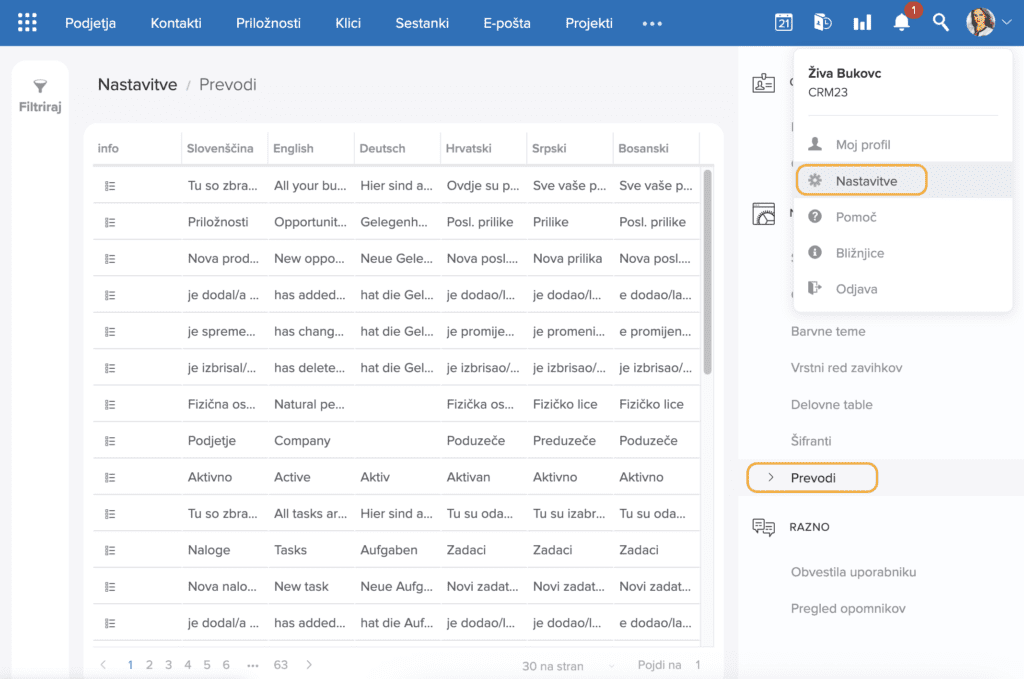 Ko se bo uporabnik ponovno prijavil v Intrix bo imel v okviru “Nastavitev aplikacije” tudi na voljo možnost “Prevodi“.
